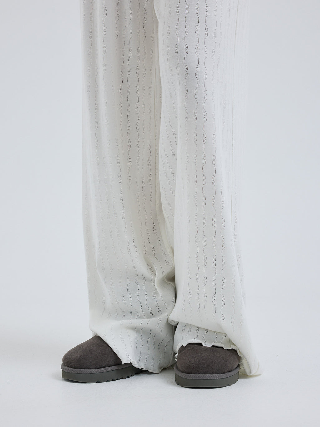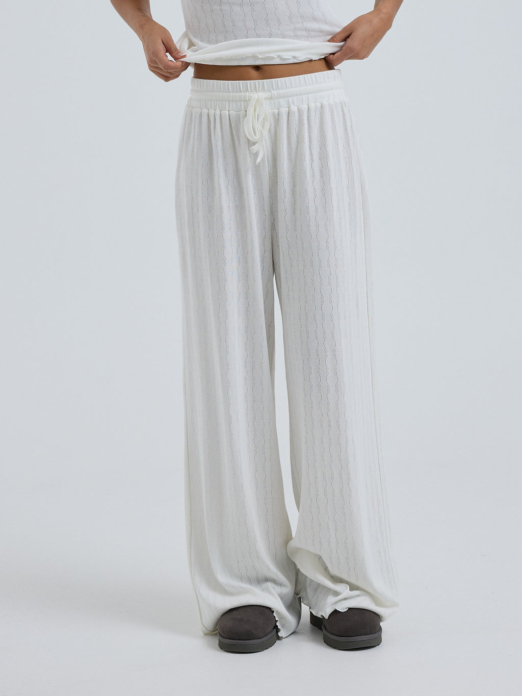 Pointelle pants with elastic and string waistband.
