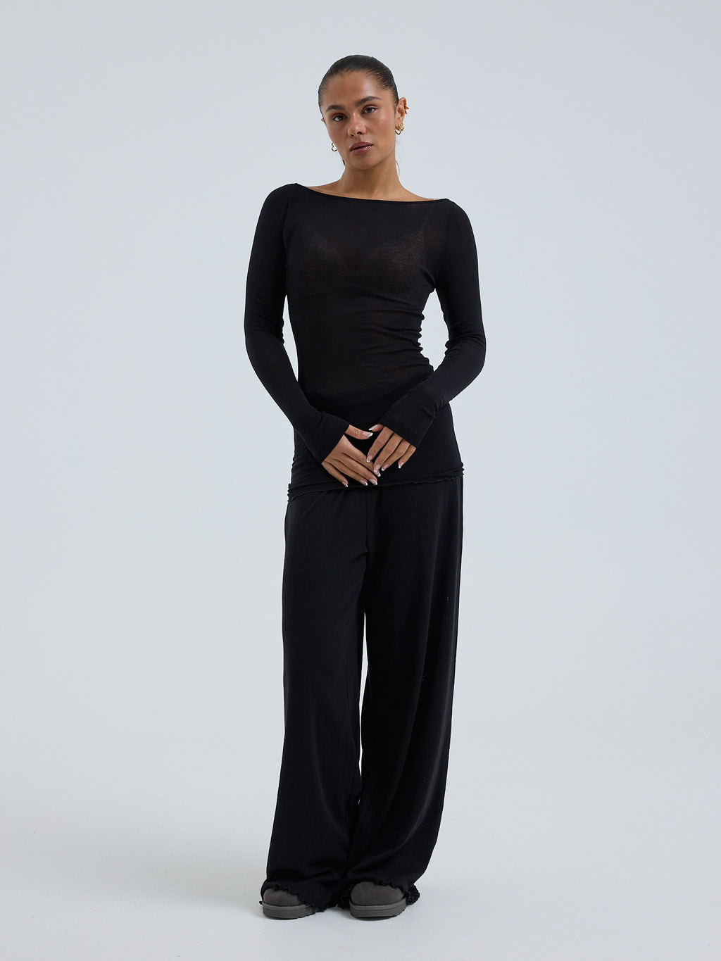 Blouse with boat neck and long sleeves.